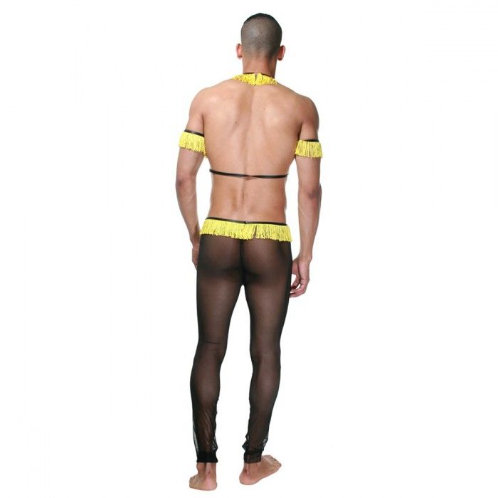 Мужской костюм танцора, состоящий из штанов из полупрозрачной легкой черной ткани и аксессуаров на руки, шею и грудь из черных ремешков и желтой бахромы. В комплекте: штаны, воротник со стрепами, 2 нарукавника.