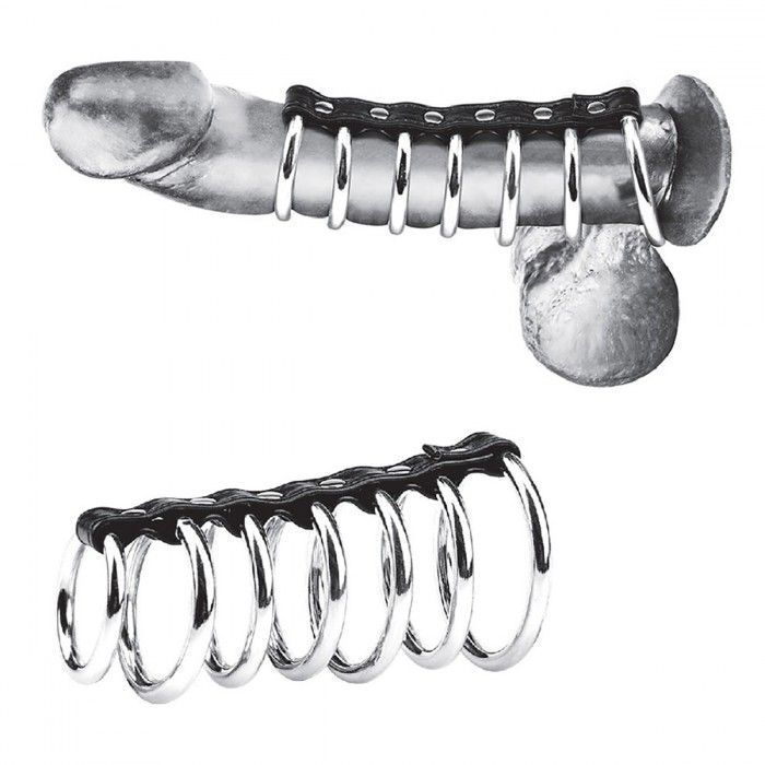 Тяжелый хомут на пенис из черной эко-кожи с 7 металлическими кольцами. Самое большое кольцо одевается за мошонку, остальные - на член. Длина ремешка - 12 см. Диаметр колец - от 3 до 5 см.