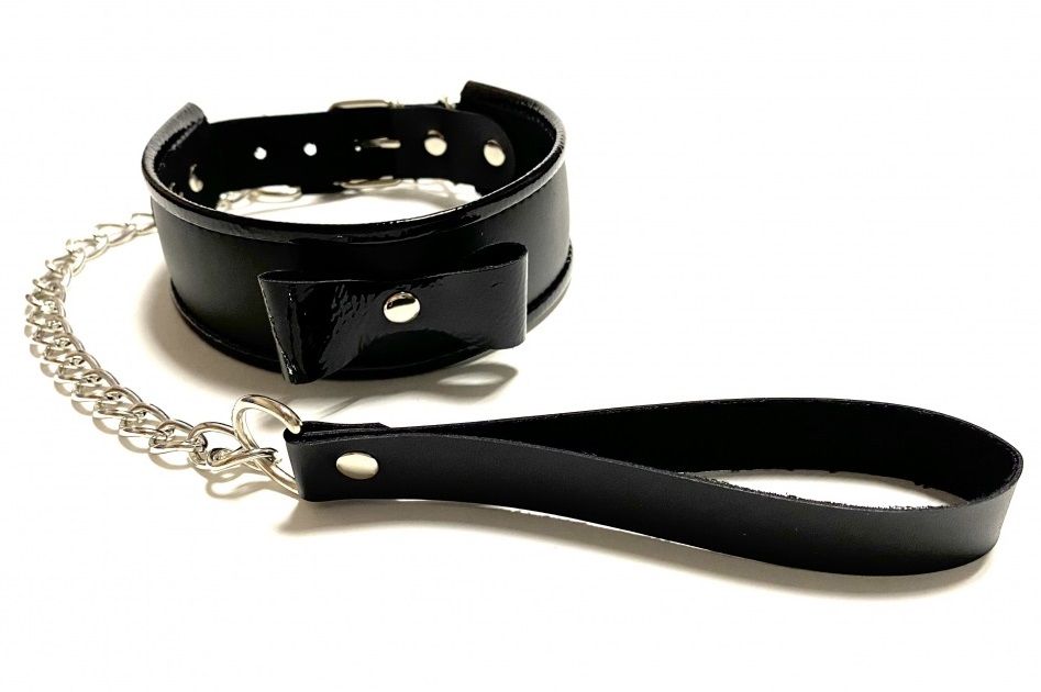 Комплект аксессуаров из ошейника с металлическим поводком, выполненный из черной искусственной кожи. Ошейник декорирован бантиком спереди и металлическим полукольцом, к которому пристегивается поводок. Основная часть выполнена из матовой эко-кожи, а бант и вставки по краю - из лаковой, что придаёт ошейнику изящества. Этот комплект поможет добавить разнообразия и стать волнующим элементом любовной игры. Экономичный, экологичный и функциональный аксессуар! Ширина - 4,5 см. Длина поводка - 45 см.