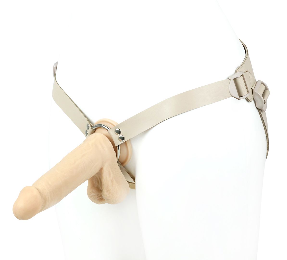 Пояс–кольцо: универсальный для реалистиков с присоской и плагов. Cнабжена кожаным бандажным поясом на бархатном основе и фастексами-быстросьемами. Модель подходит как мужчинам, так и женщинам. Регулируется по форме тела всего один раз. Дальше просто расстегивается с помощью пряжек-фастексов и надевается в следующий раз, как готовое лекало. Металлическое кольцо в конструкции харнесса позволяет использовать любые фаллоимитаторы с присоской. В данной комплектации пояс и насадка прилагаются в телесной цветовой гамме. Такой комплект предлагается для пар, которым важна естественность и максимальная схожесть с обычным интимным контактом.